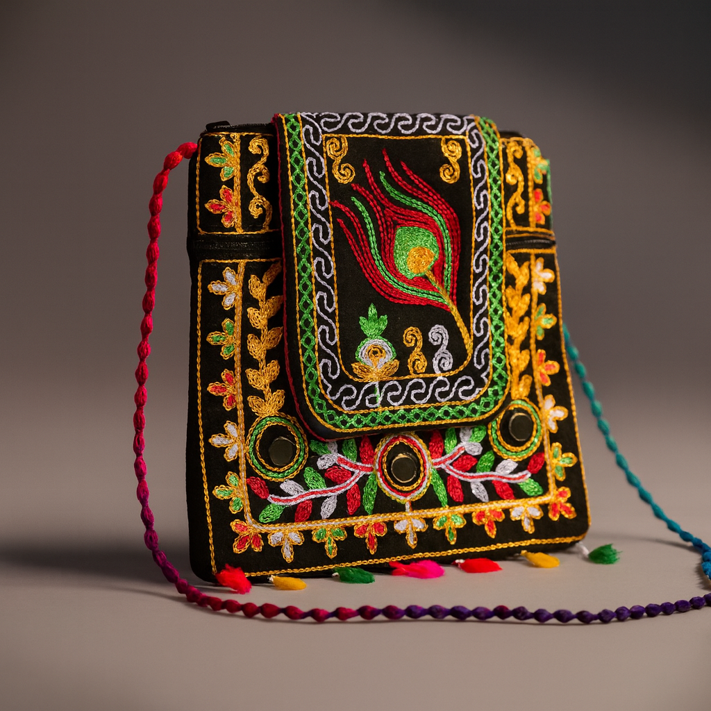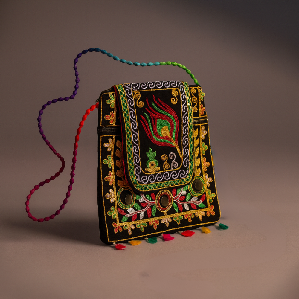 Bring elegance and tradition to your everyday look with this handmade cotton crossbody bag, beautifully crafted with colorful embroidery and fine detailing. The black base enhances the vibrant floral and artistic patterns, highlighted with mirror accents and tassels, making it a stunning boho accessory. Designed with a multicolor braided strap, this bag offers both comfort and style, perfect for wearing across the body or on the shoulder. Lightweight yet durable, it provides enough space to carry essentials like a wallet, phone, and keys. Made with eco-friendly cotton, this bag combines sustainable fashion with artisanal craftsmanship. Ideal for festivals, travel, casual outings, or gifting, this embroidered crossbody bag adds a pop of cultural charm to your wardrobe.