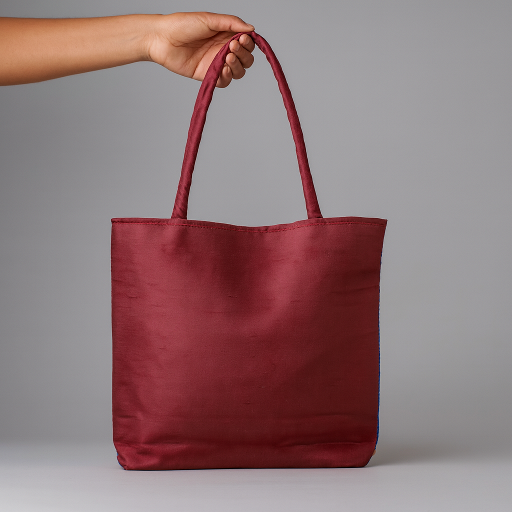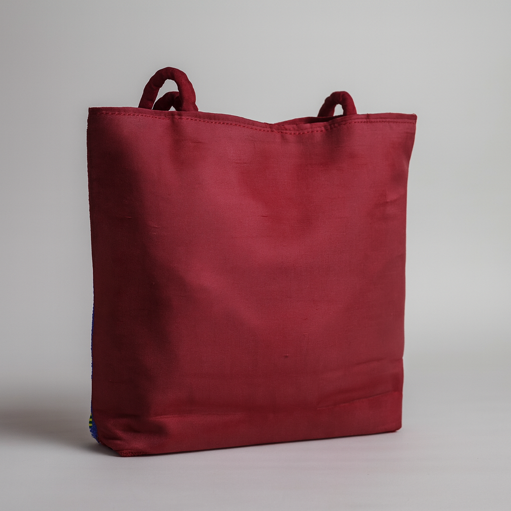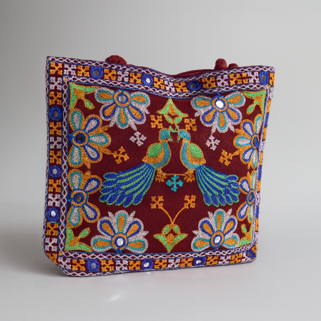 Elevate your everyday style with this stunning handmade cotton tote bag, crafted with intricate embroidery and mirror work. Featuring vibrant floral patterns and elegant bird motifs on a rich maroon base, this eco-friendly bag blends tradition with modern functionality. Perfect for casual outings, shopping, or as a unique gift, it showcases the beauty of artisanal craftsmanship while offering durability and ample space. The soft cotton fabric ensures comfort, while the detailed embroidery makes it a true statement accessory. Each piece is carefully handcrafted, making every bag one-of-a-kind and a celebration of Indian heritage. Whether paired with ethnic or contemporary outfits, this embroidered tote bag adds a colorful, cultural flair to your wardrobe.